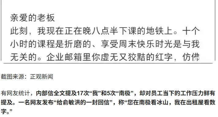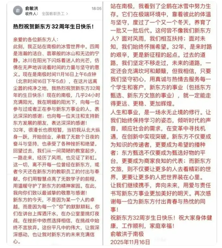 第三年,经济下行,还在煲心灵鸡汤。全文空洞无物。先看开头。“此刻,我正站在南极的冰雪世界中。四周是浩瀚的洁白、翡翠般的冰山和无边的宁静。冰川在阳光下闪烁着迷人的光芒,仿佛在无声地诉说着时间的力量与坚守的意义。”评价:空洞无物。第二段:“你们用智慧点亮了无数学子的前程,用温暖守护了新东方的精神家园。在此,我向你们致以最诚挚的敬意与感谢!”评价:还是空洞。过去经济上行,打鸡血是有用的,毕竟至少部分能兑现。尽管兑现的原因未必是老板大方,而是市场奖励和时代红利。但现在经济下行,你再搞“望梅止渴”,万一前面没有梅子怎么办?军队可能要哗变了,所以曹操其实也是赌一把。精神胜利法一定要看场景,不能乱用啊。要我说,还不如多放一天假,或者多发一个月的绩效奖励,哪怕借这个机会搞一次“优秀员工”的精神嘉奖,都比这个实在。对不对?